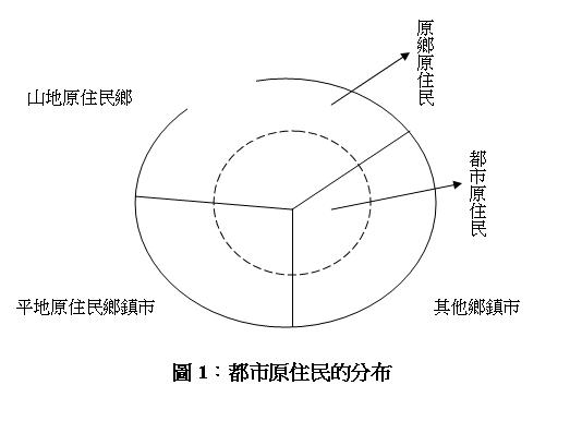 我們《九十一年台灣原住民統計年鑑》(行政院原住民族委員會,2004)當中的原住民人口分布統計表來看(表3-1,頁55),原住民的總人口數是依據居住的地方來分類的,也就是相互排斥的山地鄉、平地鄉(鎮、市)、以及都會區三大部分,百分比分別是38.0%、28.9%、以及34.1%。