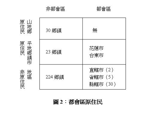 我們認為,在考慮原住民居住地區的社會經濟條件之後,都市原住民的人數應該以居住在都會區為標準,也就是在現有的2個直轄市、5個省轄市、32個縣轄市(圖2)。如此一來,應該加上屬於原住民平地鄉鎮市的花蓮市、以及台東市,再扣除非原住民地區的224個非都會區鄉鎮。