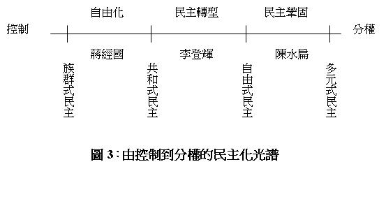 戰後以來,台灣由威權體制的自由化、民主轉型、到民主鞏固的追求,經歷蔣介石、蔣經國、李登輝、到陳水扁,大致可以用族群式民主、共和式民主、自由式民主、多元式民主的遞嬗來描述(圖3)。在這同時,中華民國的族群政策是由支配族群的文化來建構國家、以色盲的方式來看待少數族群的文化特色、容忍少數族群的文化差異、到接納族群的多元文化(施正鋒,2007a、2007b)。具體而言,就是由同化政策逐漸調整為以多元文化主義為圭臬。