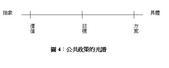 action),那麼,由抽象到具體的層次,都市原住民政策應該在光譜上有傾向、目標、以及行動的區別。具體而言,如果我們同意多元文化主義是我國族群政策、原住民族政策、以及都市原住民政策的基本價值的話,在進行行動方案的規畫之前,我們必須有介於中間的基本目標、或是方針(圖4),否則,我們不僅很容易在巨細靡遺的具體行政措施中迷失,也無法評估究竟這些預算的執行,是否能真正達成我們所追求的價值。