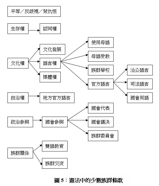 rights)分為文化權、自治權、以及政治參與權三大類。我們歸納民主國家的憲法,將有關少數族群權利保障的條款,分類如下(圖5):