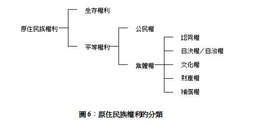 我們接著根據『聯合國原住民權利宣言』(2007),把原住民的權利分為生存權、以及平等權兩大類;平等權可以將其分為公民權、以及及集體權,而集體權又包括認同權、自決權、文化權、及補償權。