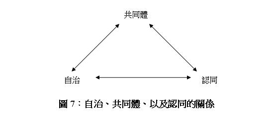 透過自治,都市原住民可以在都會區建構新的共同體,並且凝聚新原鄉的集體認同;此時,這個共同體將是自治體制、以及認同的基礎;當然,這種非本質的集體認同,將是建構共同體、實踐都會自治的動力(圖7)。