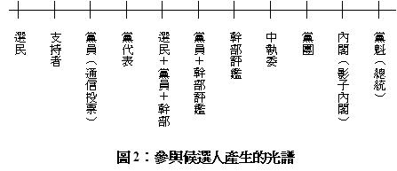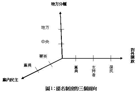 一般而言,政黨的提名制度有三個面向(圖1)。首先,是黨中央掌控提名、或是允許地方黨部分權(decentralization)的程度;再來,是政黨菁英允許一般黨員參與提名的程度,也就是所謂的黨內民主、或是民主化(democratization)的考慮;最後,是政黨提名機制對外開放的程度(inclusiveness),也就是由黨員擴及支持者,譬如美國式的直接初選(direct primary),甚或於一般的選民,譬如民進黨與國民黨所採取的民調方式。其實,這三個面向是高度相關的,也就是說,我們可以根據提名選擇者(selector),適度的合併而作光譜式/階梯式的呈現(圖2)。