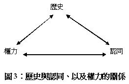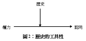 其實,對於歷史作如此的工具性理解,只能說是將歷史當作一種權力與認同之間的中介變數而已,也就是說,權力關係決定了認同如何作定義,而歷史只是用來強化、或是減弱這樣的關係(圖2)。如此一來,不只是說歷史的書寫淪為臣服於政治力量的次要因素,連認同的形成也只能由權力來作想像,這當然是過於決定論的看法。這就是所謂的「歷史的政治」(politics of history)。