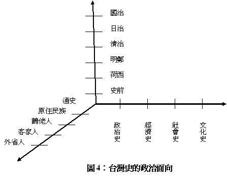 大體而言,我們可以由三個面向來看台灣的歷史呈現(圖4):首先,就縱切面而言,我們可以由原點的通史出發,然後,隨著時間的推移,可以有史前、荷西、明鄭、清治、日治、以及國治等斷代史;接著,從橫切面來看,我們可以有政治史、經濟史、社會史、以及文化史等專史;再來,我們依據書寫的對象(object)、或是主體(subject),也可以分別有族群、或是民族史,譬如原住民族、鶴佬人(福佬人、閩南人、河洛人、Ho-lo)、客家人(客人)、或是外省人(新住民)。