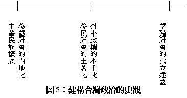 儘管我們看到學者刻意避開政治立場、小心翼翼地要想從事「中立」台灣史研究,特別是動輒得咎的政治史,然而,如果沒有史觀,所謂的「客觀」呈現,充其量也不過是拾人牙慧的史料堆砌,甚或於充當政治正確的幫兇,譬如過去國民黨的政治控制、或是中國的「政治牽扯」。不過,當政治學者陳延輝(2002)寫出〈有關台灣政治史編寫的思考〉,頗有「有為者亦若是」的自我期許。我們可以將書寫台灣政治史的觀點,大略歸納為中華民族擴展/移墾社會的內地化、移民社會的土著化(indigenization)/外來政權的本土化(naturalization)、以及墾殖社會的獨立建國三大類(圖5)。