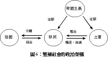 台灣的社會結構可以說是前面兩者的結合,也就是說,這是一場同時在進行兩條戰線的奮鬥:對內而言,首先,墾殖者(鶴佬人、以及客家人)與新移民(外省人)搶奪政權的主導,其次,兩者必須面對原住民族(平埔族)消聲匿跡的歷史責任,再來,在全球化的情況下,本地人必須思考如何接納最新一波的移民、以及心繫台灣的外移離散者(diasporas);對外而言,這個國家除了要面對母國併吞的威脅、以及統派的木馬屠城,還要時時提防其他強權的覬覦、以及買辦的裡應外合。我們(施正鋒,2001a)先前曾經建構了一個墾殖社會的政治架構(圖6),在此略加修飾(圖7),也就是把移民再區隔為墾殖者、以及新移民,以呈現不同波移民可能存在的差異,同時,也顯示強權與母國之間的關係、及其對墾殖國家可能的影響。