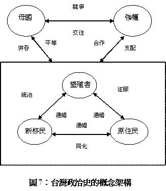 由「內地化」到「土著化」,詮釋台灣政治史的最大瓶頸,就是無法突破一個民主政治上最基本的原則,政治制度/政權/國家是因為人民而設計的,不應該勉強老百姓要去接受不請自來的統治者,因此,如果說異族的荷西、日本、甚或滿清政權都是殖民政府,那麼,漢人的明鄭、以及國府政權所遂行的就是一種「內部殖民」,也就是試圖就地合法的違章政權,卻不改政治垂直分工的本質。就內部統治階層人數的多寡而言,不管是典型的金字塔型少數統治(譬如荷西、鄭治、清治、日治、國治)、還是倒金字塔型的多數統治(譬如漢人之於原住民、或本地人之於新移民),只要支配關係存在,即使被支配者心甘情願,這就是殖民統治(colonialism);即使所謂的本土菁英取代殖民者上台,只要原住民族永遠在社會的最底層沉淪、後來的移民不願/無法把這塊土地變成自己的新故鄉,那麼,所謂的「本土政權」,也不過是一個披著原生特質的「族群化國家」(ethnicized state),而原本期待的包容性(inclusive)「公民式民族主義」(civic
