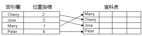 一般查詢資料是採取循序的方式,若檢視資料表的每筆記錄,則需花費許多時間。如同圖書館的書籍,想要尋找想借的書通常會利用目錄索引找出書放於何處。這種搜尋資料的觀念也被應用於資料庫的管理中。一種簡單的資料表索引架構如圖5-157 所示,其中索引資料由資料表的某個欄位重新排序,與記錄該欄位資料在原資料表內的位置指標所構成。由於索引資料比原先的資料表小,可置於記憶體中處理,加速搜尋資料的速度。如果以鍵值當作索引欄位,這種索引稱為主索引(Primary Index),否則稱為次索引(Secondary Index)。一個資料表只能定義一個主索引。索引欄位的選取與查詢的型態密切相關,例如使用者經常以姓名來查詢學生資料,建立姓名的索引會比學號的索引有用。