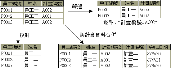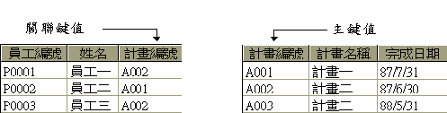 資料與資料之間可能彼此之間有相對關係,這些關係該如何用資料表表達呢?資料表的欄位所記載的資料有個限制,即只能表示單一的個體,不能在同一個欄位記載兩筆以上的資訊。例如一個計畫資料表其中的一個欄位是記錄參與各計畫的所有員工編號,則儲存的結構不支援。也就是限制一個員工至多只能參與一個計畫,則所參與的資訊就可以記錄在員工資料上(如圖5-158 所示)。若是要記錄一個計畫有許多人加入,則需將計畫資料表的主鍵值(即計畫編號)加入員工資料表中。所增加的欄位一般稱關聯鍵值(Foreign Key),這兩個鍵值存在一些互動性: