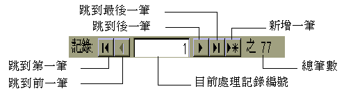 表示新增記錄的插入位置。視窗左上角的方塊為「全選按鈕」。底端的「工具框」在操作資料時會使用。