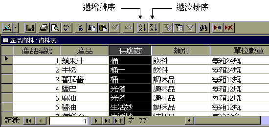 將游標移至欲刪除的記錄上,按「工具列」的刪除鈕 排序的作用是將資料表的記錄,依某種次序排列,方便使用者的瀏覽。操作的方式為:選取排序依據的欄位,選擇排序的方式(按「工具列」的遞增鈕