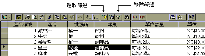 從資料表中直接選取篩選的條件,可以是相鄰欄位的資料或是相鄰記錄的資料,然後按選取篩選鈕