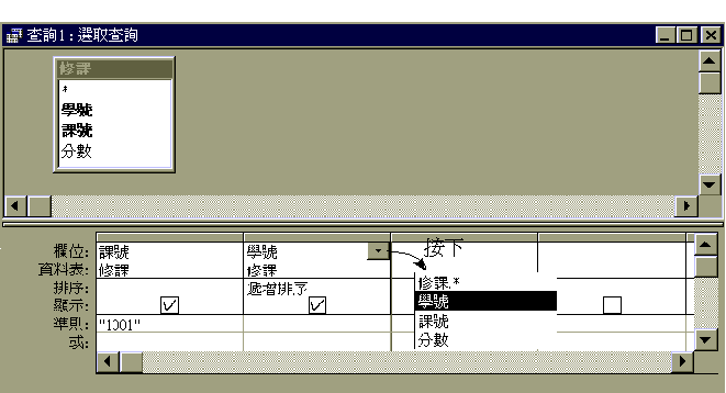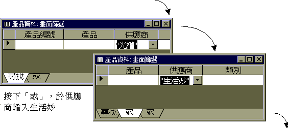 後,資料表剩下一筆空白的記錄,於空白欄位處可輸入條件,或按下欄位旁的按鈕,會將此欄所有相異的資料以選單的方式供您選擇。如果要建立或的條件,請按底端「或」的圖示,多個條件時,按下最後一個「或」就可新增一個條件式。