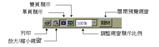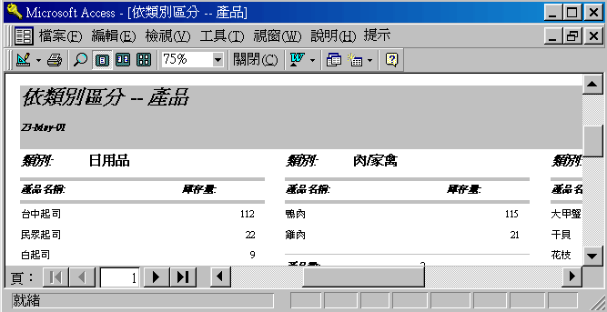 按「報表」標籤選取欲開啟的物件,例如選取依類別區分產品, 按下「預覽」,出現如圖 5-169 的視窗。其中內容顯示產品資料表的產品名稱,並依類別分組,而底端的工具框可用來跳至特定頁。報表主要做為輸出的清單,因此只有列印的操作,上方工具列左邊的按鈕說明如圖 5-170 所示。
