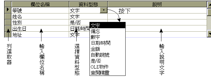 設計檢視視窗分上下兩部份,上半部如圖 5-176 所示,主要做為欄位名稱的輸入與資料型態的設定。而說明這一項可有可無,只做為附加的文字解說而已。資料型態的輸入可透過選單的方式選取(如圖所示)。視窗左邊的列選取器可選取整列的資料,進而做刪除、插入與搬移欄位的處理。