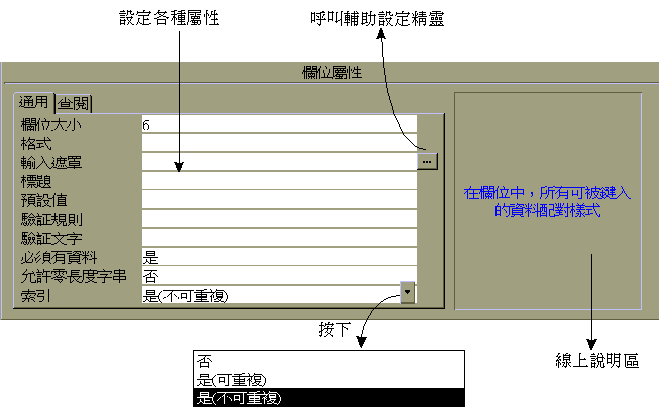 欄位 名稱  | 資料 型態  | 欄位 大小  | 標題  | 預設值  | 必須有資料  | 允許零長度字串  | 索引  |