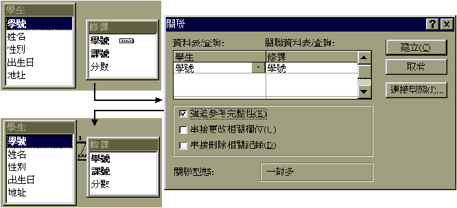 建立欄位間的關聯時,請點選資料表的欄位,按住左鍵將游標移至另一資料表的欄位上,如圖8-26的範例所示,其中建立學生學號與修課學號的關聯。接著出現「關聯」的視窗,選取"強迫參考完整性"的選項(這種選項會驅使系統嚴格檢查關聯間的限制),然後按「建立」,圖上會呈現1-
