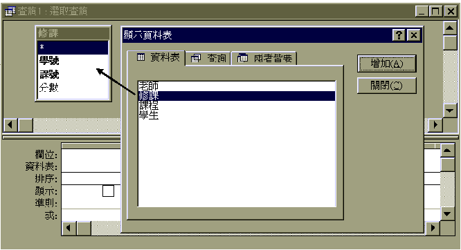 如果我們想要從修課資料表,得知某個課程的修課學生有哪些,一種作法是利用8.2節有關資料表的篩選技巧,另一種方式是建立查詢。後者的優點是以後遇到相同的需求時能避免重複的操作。底下介紹查詢建立的方式。首先於資料庫視窗的查詢標籤下新增物件,選取「設計檢視」的設計方式。於顯示資料表視窗中點選修課資料表,按「增加」(如圖 5-181 所示),最後按「關閉」。