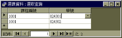 輸入關聯鍵值時,必須留意輸入值不能超過所參考的主鍵值範圍,否則容易出現無法參考的錯誤。如果將主鍵值的內容列出,然後以選取的方式輸入,自然能避免這種錯誤。這種功能可透過設定欄位的查閱屬性達成。下面介紹修課資料表中,學號與課號的設定方式。如果修課資料表尚未開啟,請利用「設計」按鈕開啟,否則選擇功能表「檢視」「資料表設計」,進入修課資料表的設計檢視模式。選取「查閱」標籤,輸入屬性值。儲存後選擇功能表「檢視」「資料工作表」,查看資料表內容。將游標移至學號或課號即可。