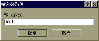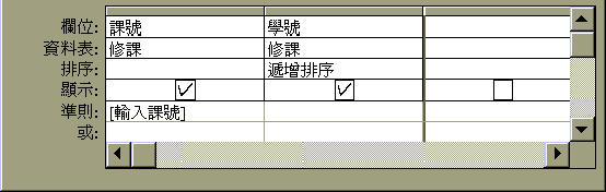 請依圖5-182 設定資料並儲存命名為"選課資料"。選取功能表「檢視」「資料工作表」,便可查看此查詢的結果(如圖 5-183),其中顯示選修課號為"1001"的學號。如果想查詢其他課號的資料,必須修改準則部份,這種方式明顯地缺乏彈性。現在請選取功能表「檢視」「查詢設計」,依圖 5-184 修改準則為"[輸入課號]"。存檔後再查看一次,此時畫面出現圖 5-185 的對話方塊,其中可輸入任意課號。這種用中刮號表示的字串,可達到條件的參數化。