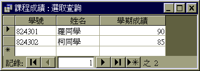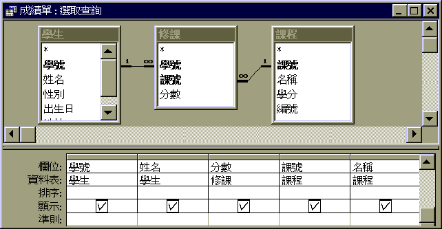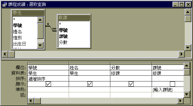 如果想進一步知道選修某個課程的學生成績與姓名,光靠修課資料表是不夠的。因為姓名資料記錄在學生資料表上,必須合併這兩個資料表,才能完成此類的查詢。這種合併查詢的建立方式如下。仿照之前建立查詢的方式,新增查詢並於顯示資料表視窗中,同時增加修課與學生資料表。依圖 5-186 輸入相關資料,存檔並取名為"課程成績"。課號"1001"的執行結果如圖 5-187 所示。