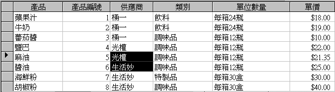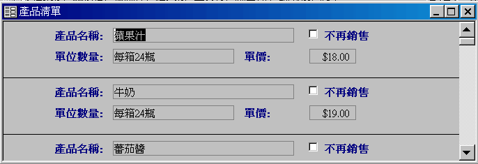 按「表單」標籤選取欲開啟的物件,例如選取產品清單,按下「開啟」,出現圖 5-168 的視窗。其中內容顯示產品資料表的部份欄位資料,注意欄位安排的方式有別於資料表,這正是表單的功能,請自行安排與設計介面。表單可供檢視與修改資料,其資料操作的能力與表單的屬性設定有關。