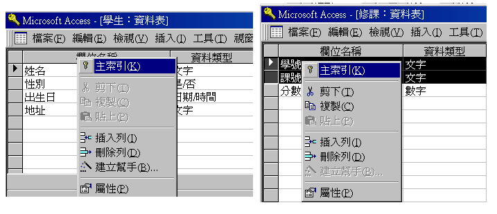 視窗下半部如圖5-177 所示,可替每個欄位設定屬性。屬性分「通用」與「查詢」兩類,查詢屬性在資料型態為查閱精靈時會使用到。設定某個欄位的屬性時,先將游標移至上半部視窗的欄位記錄上,如學號欄位的任何位置皆可,則下方即為學號的屬性值。設定屬性時仍可利用選單選取的方式,或透過輔助精靈。完成屬性設定後,必須從欄位中選取一個當主索引(或主鍵值)。首先以列選取器選擇要成為索引的欄位,按下右鍵呼叫快速功能表,選取「主索引」(如圖5-178 的範例)。如果主索引由兩個以上的欄位所組成,請按下列選取器並拖曳滑鼠。現在請依序建立四個資料表物件,並取名為學生、老師、課程與修課。建立完成後請別急著輸入資料,我們還需建立資料表間的關聯資訊。