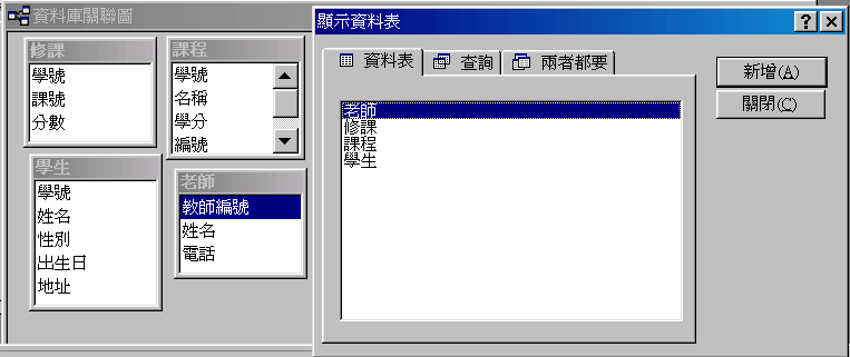 在設計檢視中只能設定單一資料表的屬性,而資料表欄位間的主鍵值與關聯鍵值的關係並未設定。例如修課資料的學號欄位,其值必須出現於學生資料的學號欄位。Access提供圖形的介面,可以很方便地建立這種關係資料。建立關聯前請關閉所有的資料表,接著執行功能表的「工具」的「資料庫關聯圖」。螢幕出現「顯示資料表」的視窗(如果沒有請執行功能表的「關聯」的「顯示資料表」),視窗中間方塊顯示所有的資料表名稱,請逐一選取各資料表並按「增加」(如圖 5-179 所示),最後按「關閉」。資料庫關聯圖視窗中的資料表,可利用滑鼠任意安排他們的位置。
