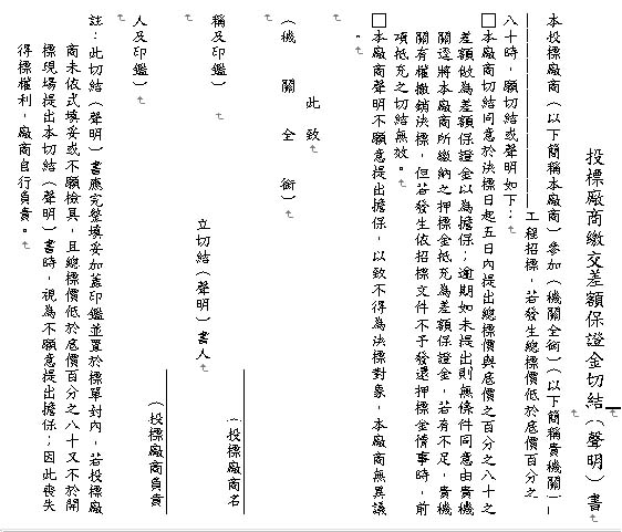 □本廠商切結同意於決標日起五日內提出總標價與底價之百分之八十之差額做為差額保證金以為擔保;逾期如未提出則無條件同意由貴機關逕將本廠商所繳納之押標金抵充為差額保證金,若有不足,貴機關有權撤銷決標,但若發生依招標文件不予發還押標金情事時,前項抵充之切結無效。