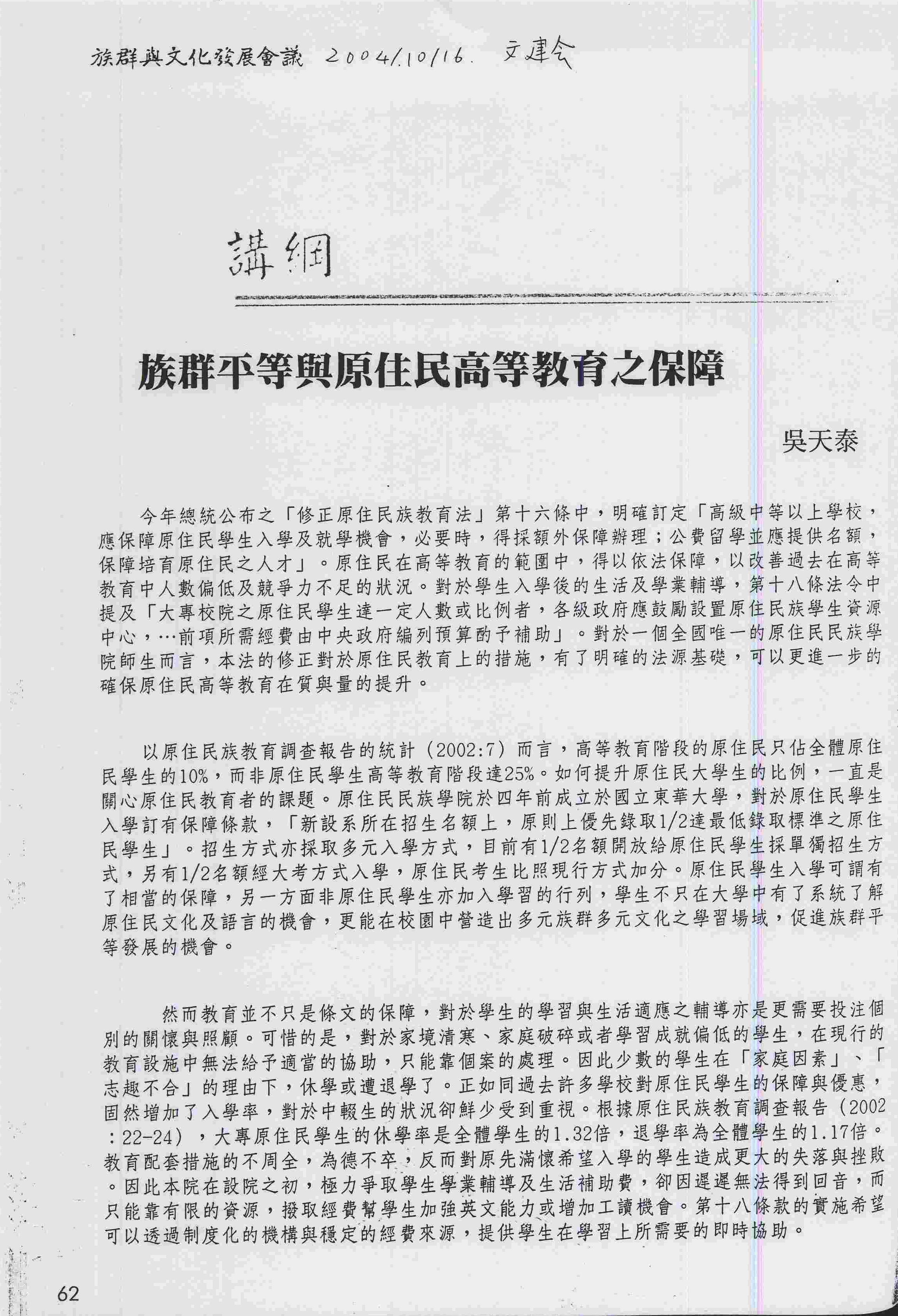 由原住民研習中心談台灣原住民的推廣教育,九十年度原住民族教育學術論文發表會暨研討會論文集,頁128-135,竹師。2001。 |